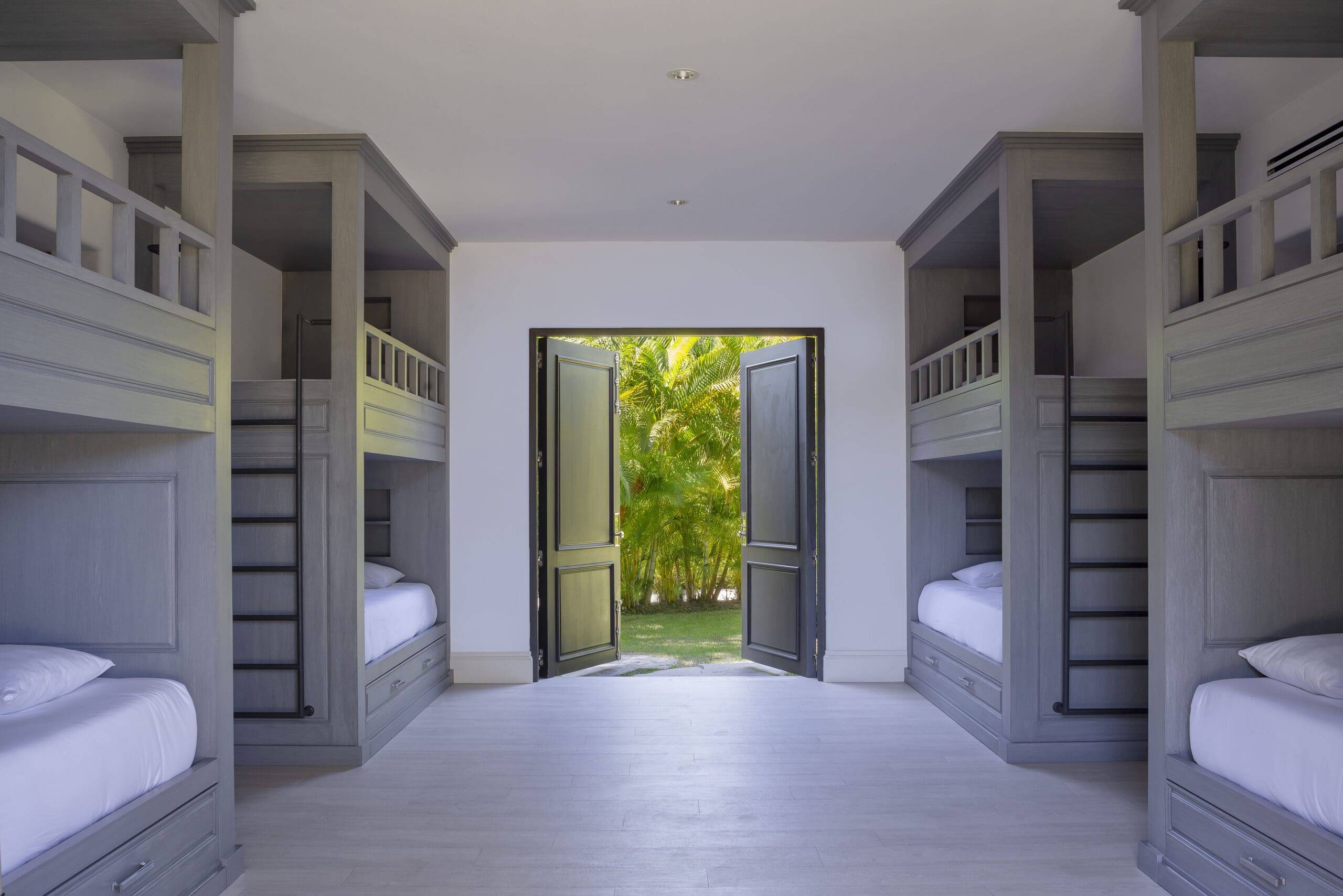 The main house at Vatulé has six bedrooms with en-suite bathrooms, five of which are honeymoon-worthy primary suites with king beds and ocean views and one of which is a children’s room with six bunk beds, its own media room and a terrace.