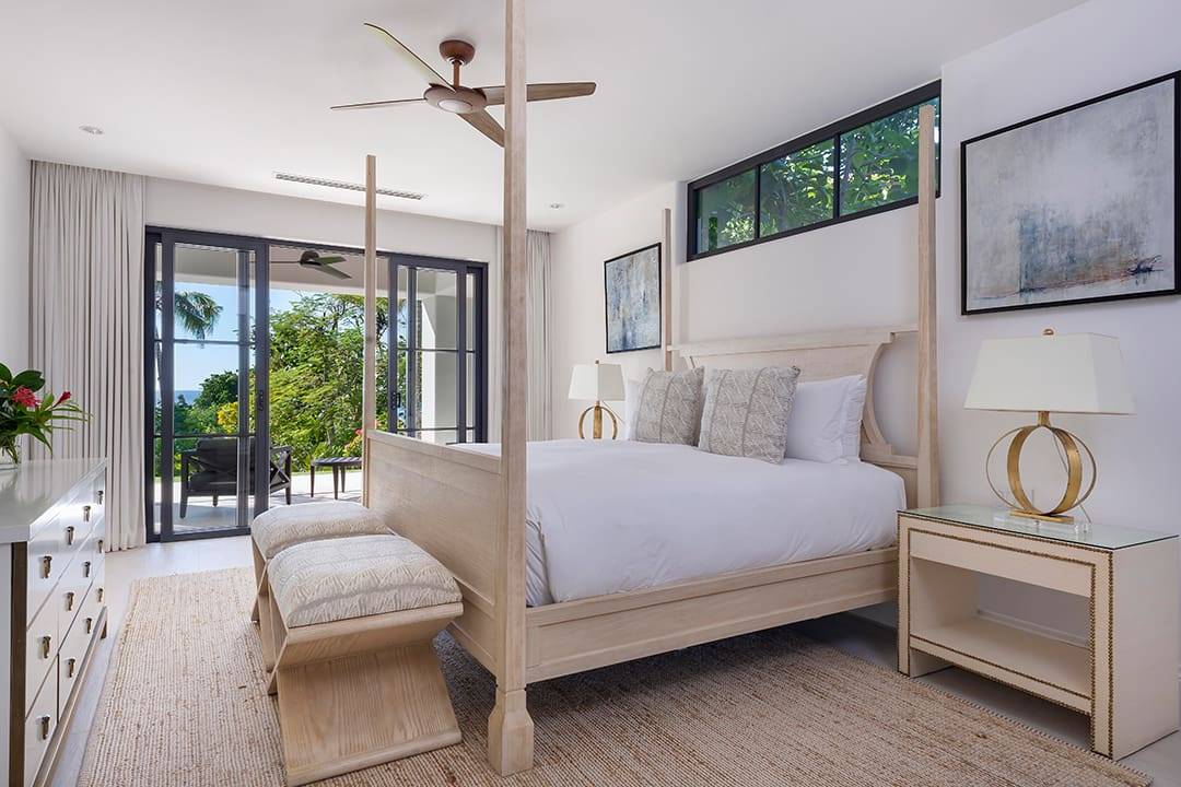 • Bedroom 5 – Guest Primary: King size bed, Ensuite bathroom with stand-alone shower, Dual Vanity, HD TV, Control 4 sound system, Ceiling fan, Air conditioning, Private balcony, Safe, View of Pacific Ocean